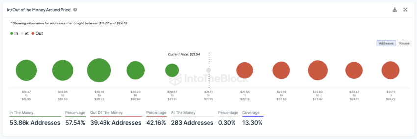 O gráfico ‘In/Out of the Money Around Price’ mostra que muitos compradores estão atualmente obtendo lucro com a LINK, com o suporte mais forte entre US$ 18,27 e US$ 20,87. Isso significa que se o preço começar a cair, provavelmente poderá se recuperar.