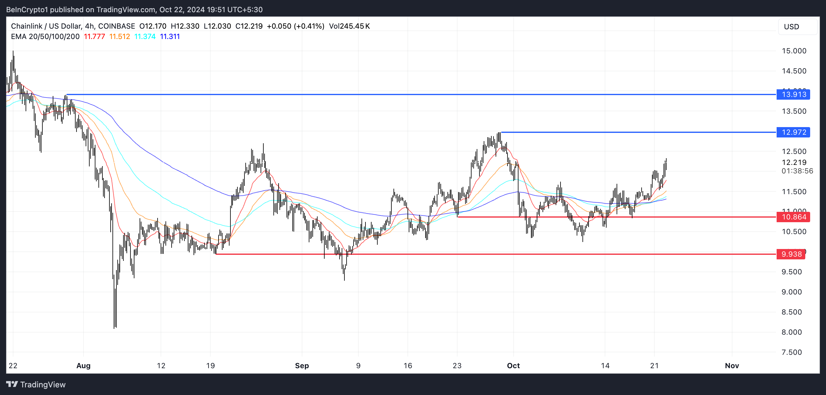 Na alta, o preço está se aproximando da resistência em US$ 12,97. Se a LINK conseguir ultrapassar essa marca, poderia subir até US$ 13,91, um crescimento potencial de 14%.