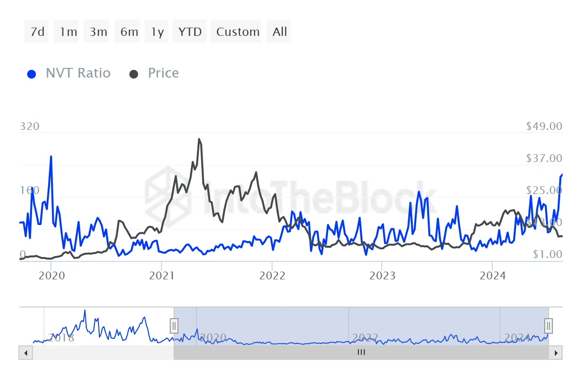 A Chainlink pode encontrar dificuldades para recuperar suas perdas recentes. Isso porque o índice NVT da altcoin atingiu seu nível mais alto em quatro anos e oito meses. Isso, por sua vez, sinaliza possíveis tendências de baixa daqui para frente.