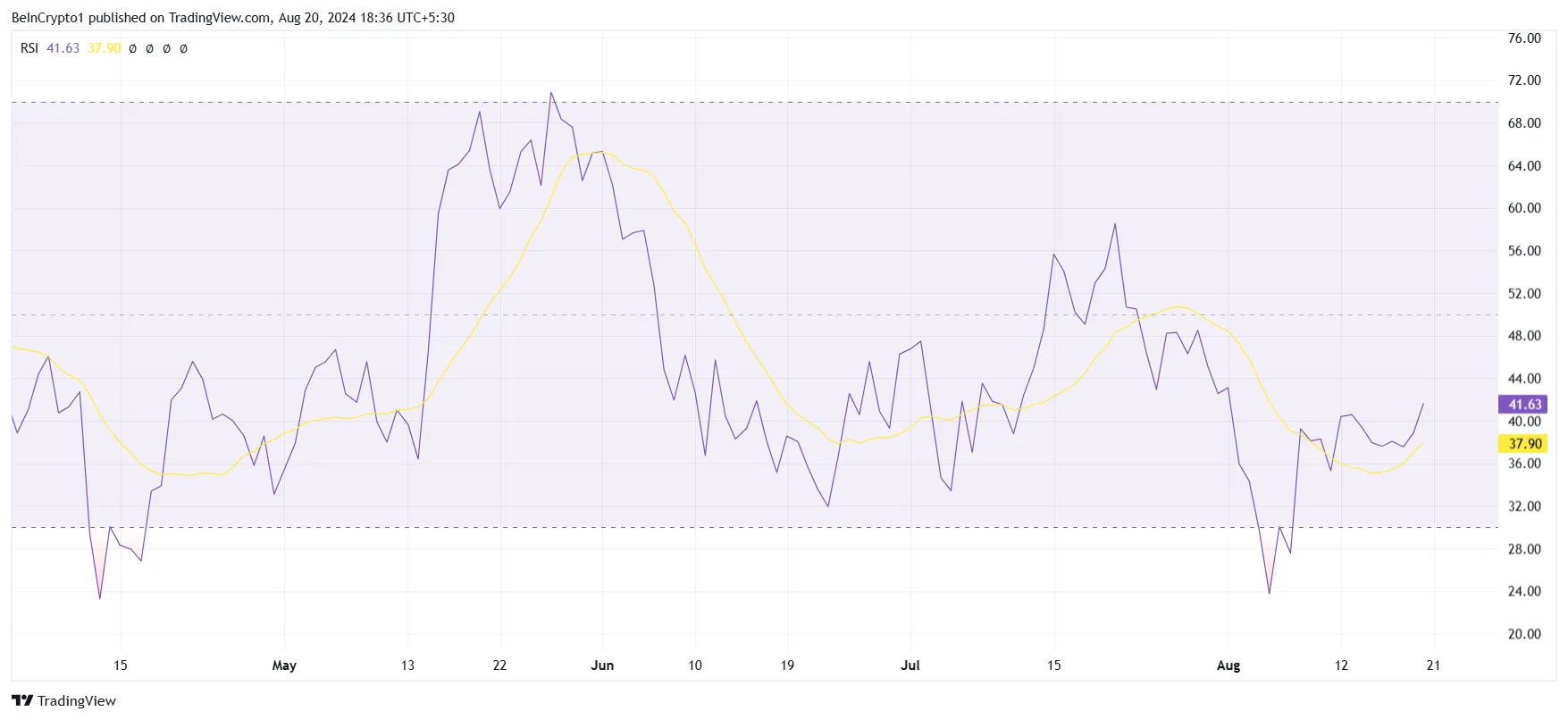 Além do NVT, o Índice de Força Relativa (RSI) da Chainlink também está na zona negativa. O RSI é um indicador chave de momento, e sua posição atual sugere que a LINK está enfrentando um momento baixista.