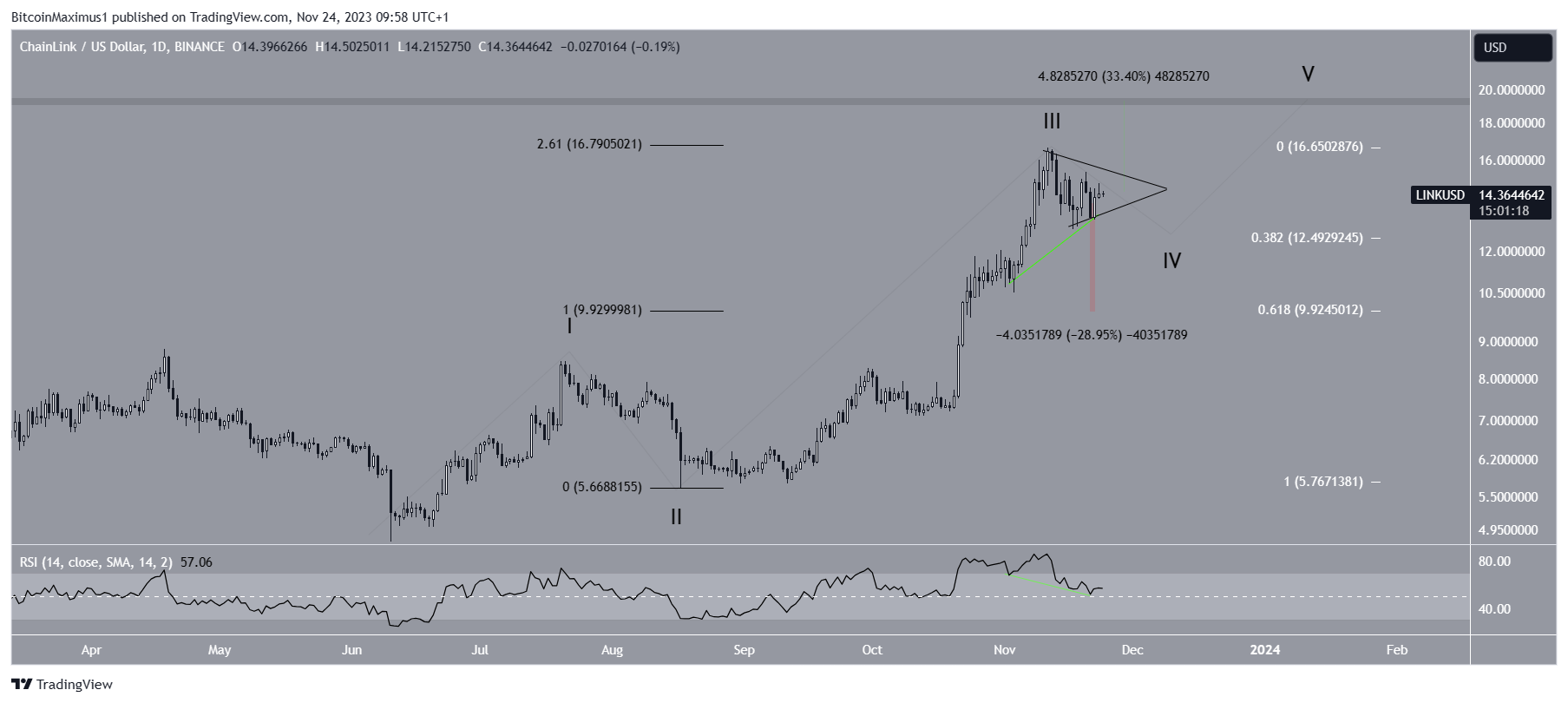 SponsoredSe a contagem estiver correta, o preço está atualmente na onda quatro, o que é corretivo. A onda quatro geralmente assume a forma de um triângulo, então o token pode se consolidar acima do nível de retração 0,382 de Fibonacci em US$ 12,50 (branco) antes de iniciar outro movimento de alta.