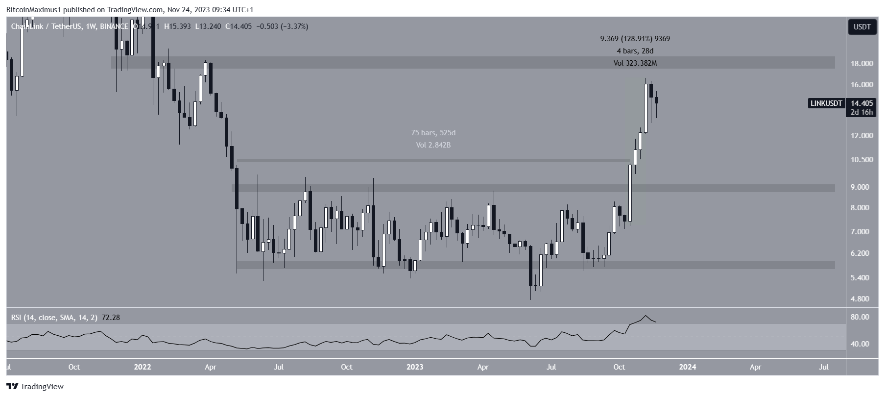 A análise técnica do gráfico semanal mostra que a LINK rompeu uma área de resistência horizontal que estava em vigor há mais de 500 dias em outubro.