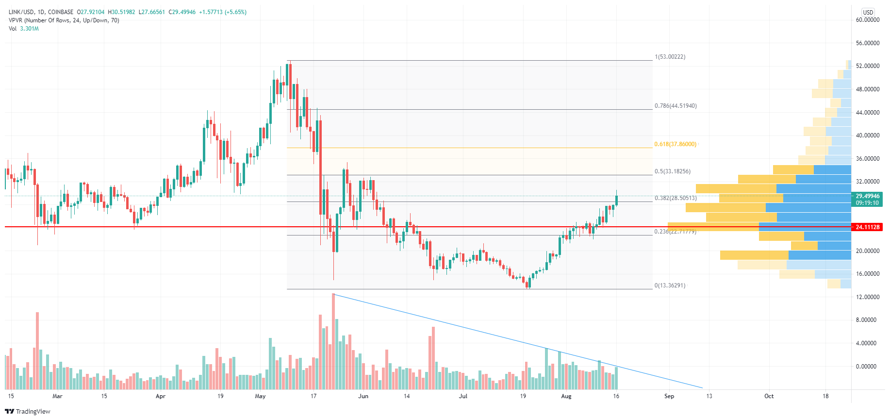 Nas últimas semanas, a Chainlink (LINK) reverteu sua tendência de baixa e recuperou a área de suporte de longo prazo próxima de US$ 24,10. Se a altcoin mantiver seu forte impulso atual, poderá ocorrer um forte movimento de alta no seu preço nesta segunda metade de agosto.