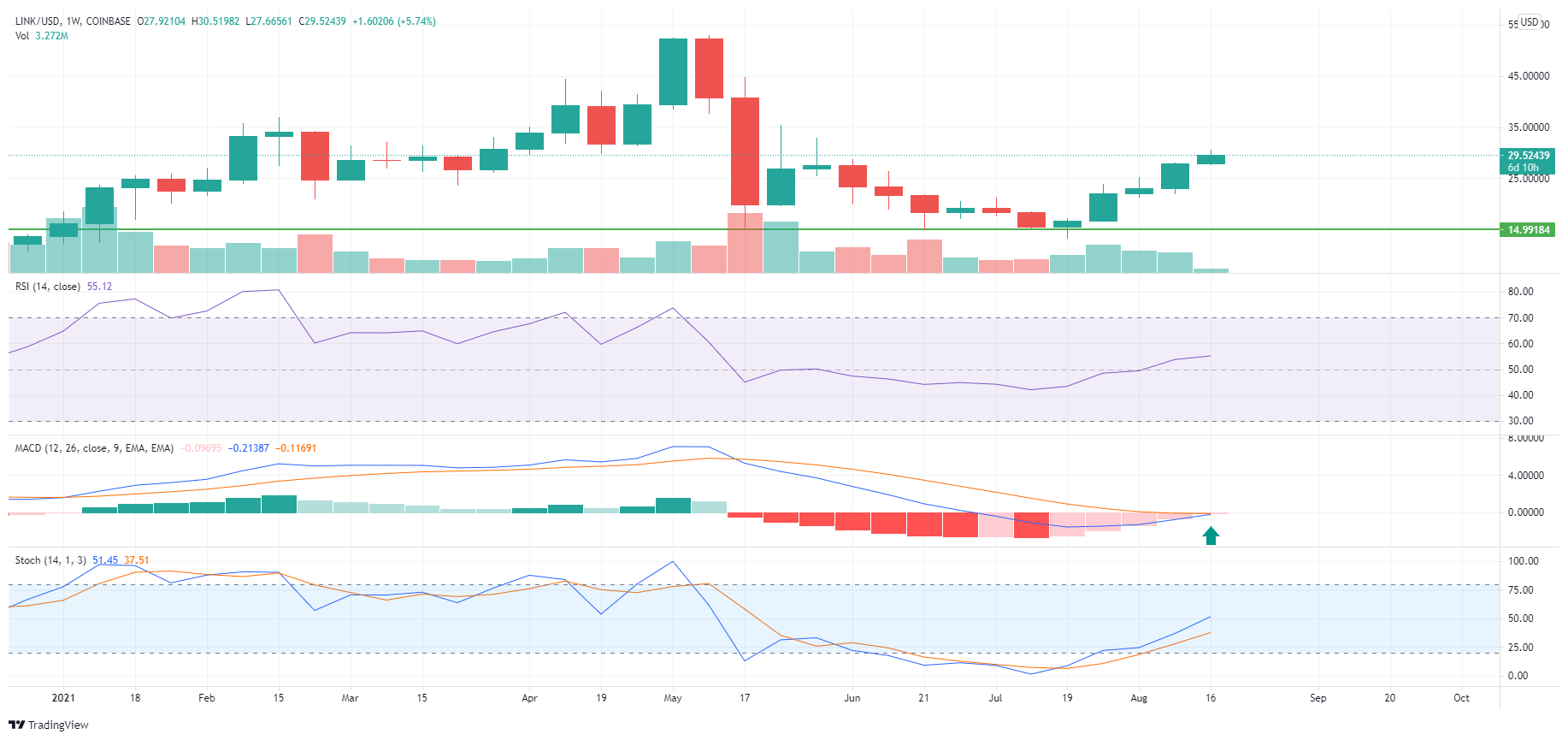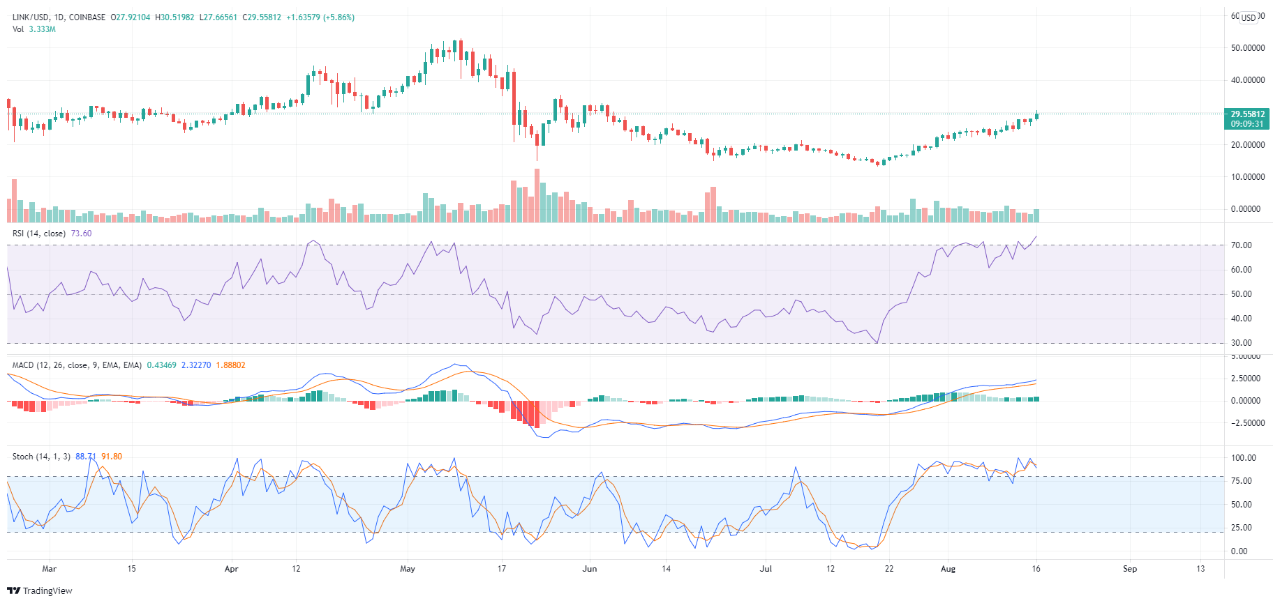O gráfico diário fornece uma leitura de alta e mostra uma reversão da tendência de baixa. O preço da LINK subiu da mínima mencionada em US$ 13,40 em 20 de julho para o topo desta segunda-feira (16) em US$ 30,50. Isso representa uma valorização de 128% em apenas 26 dias.