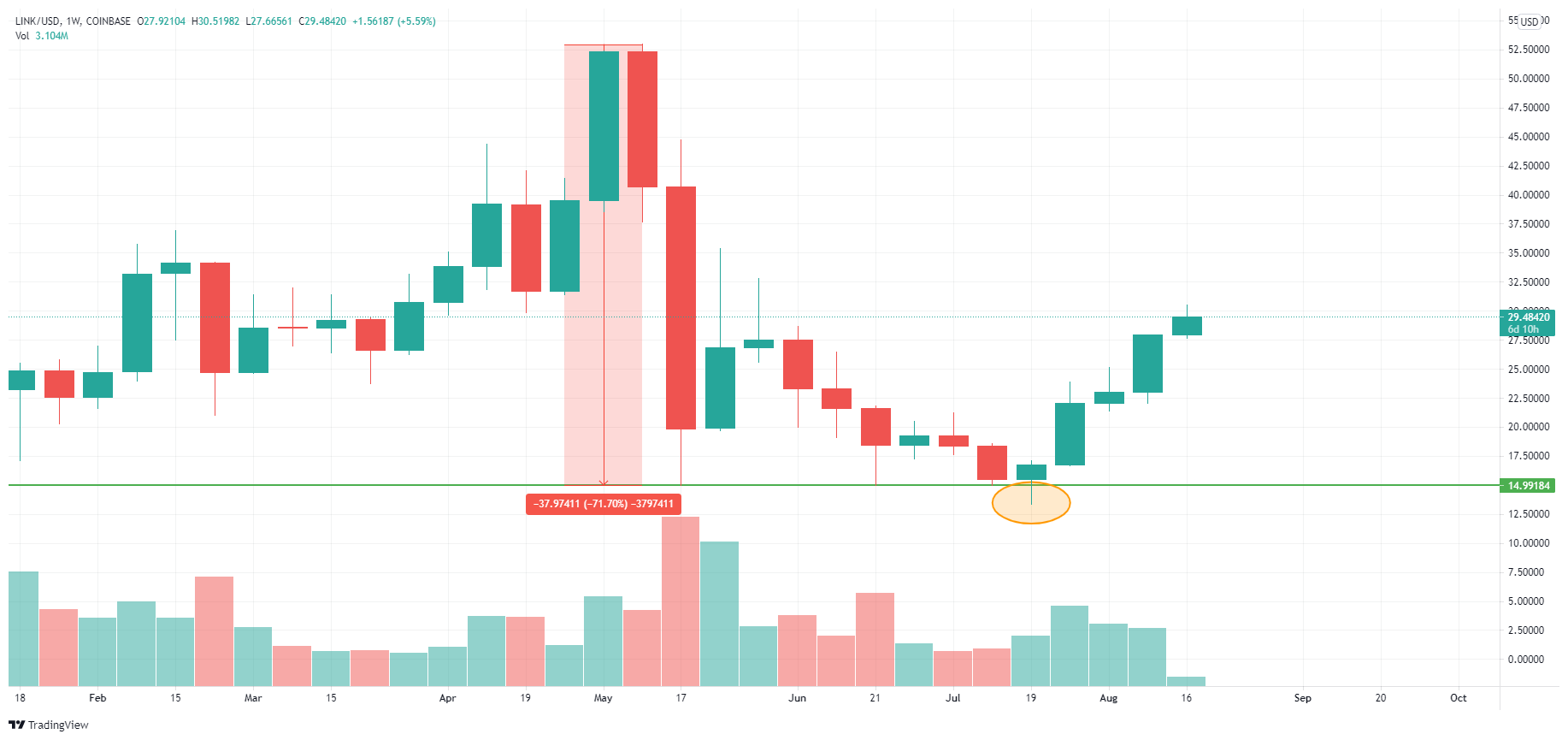A Chainlink registrou uma nova máxima histórica de US$ 53 em 10 de maio. Quase no mesmo dia, uma correção mais profunda no mercado de criptomoedas começou. O ativo, em um período de duas semanas, perdeu 72% de seu valor, caindo para uma mínima de US$ 15 em 23 de maio.