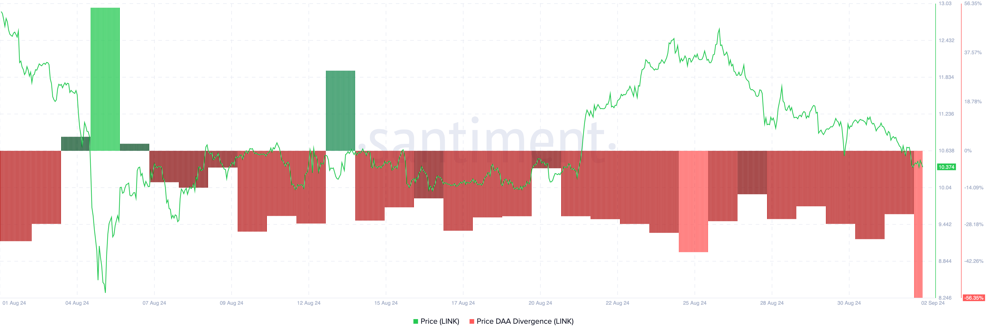 Contudo, uma diminuição no DAA geralmente é um sinal baixista. Como visto abaixo, a divergência de preço DAA da LINK está em -56,35%. Essa divergência negativa sugere uma fraca desconexão entre o preço da altcoin e o engajamento do usuário.