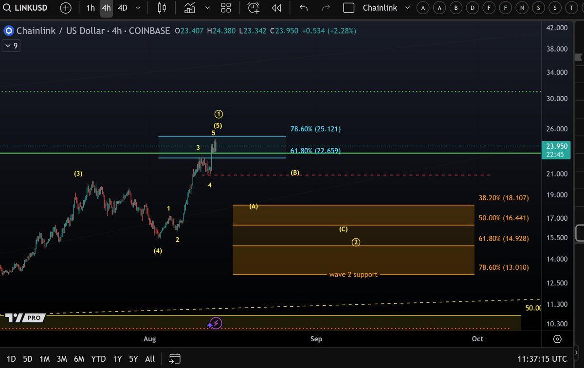 Do ponto de vista da análise técnica, a LINK completou a quinta onda esperada de sua tendência de alta e agora se aproxima da zona chave de US$ 25. Analistas sugerem que, se LINK ultrapassar esse nível, pode entrar em um rompimento direto em direção ao alvo de US$ 47 no gráfico de longo prazo.