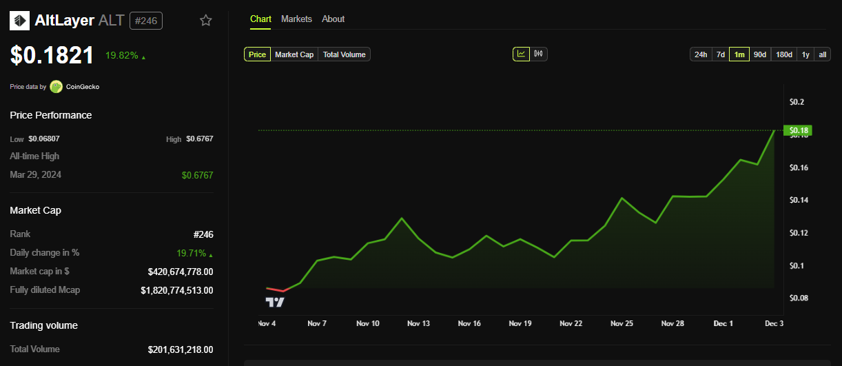 Em outro lugar, a resposta imediata do mercado à postagem de CZ colocou a AltLayer em destaque. Com o aumento da empolgação, alguns investidores especulam que a postagem de CZ aponta diretamente para a AltLayer. O token ALT da rede subiu quase 20% para ser negociado a US$ 0,1821 no momento desta reportagem.