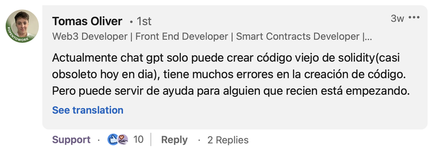 Esta pergunta gerou reações de Web3 developers, que logo pontuaram que a atuação dos LLMs em programação de código de software é limitada. E como vimos nos parágrafos anteriores, ChatGPT é falho, muitas vezes impreciso, e está sujeito a erros. Veja – figura 1: