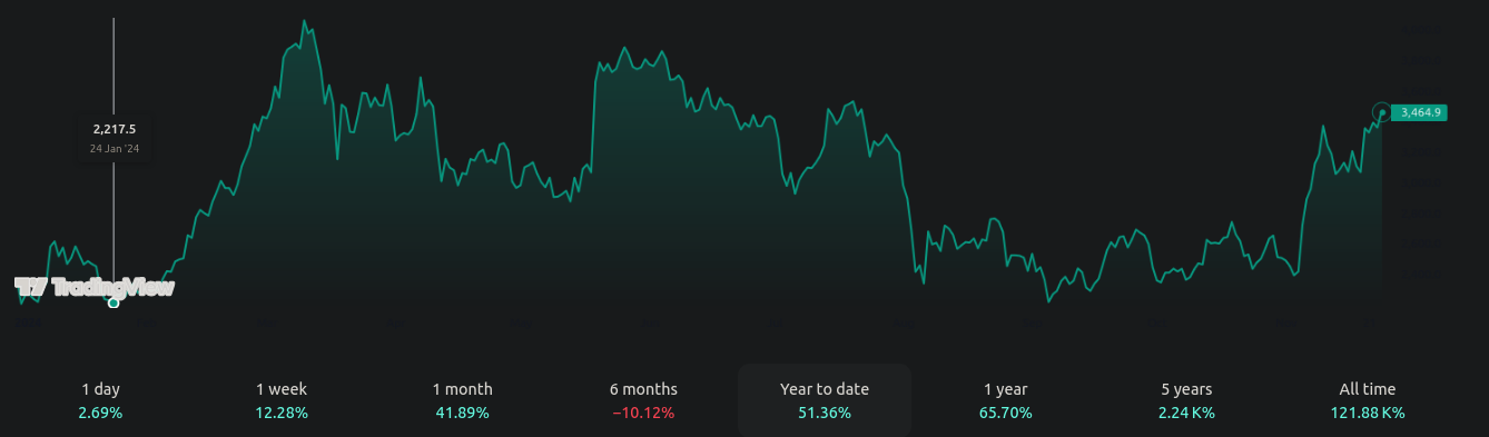 Em termos de preços, Ethereum experimentou um ano com altos e baixos, atualmente negociado a US$ 3.450, de acordo com TradingView. O aumento no interesse de investidores institucionais e a maior participação no serviço de staking graças à atualização Dencun impulsionaram o sentimento em torno do ETH. Este marco consolidou a confiança na rede.