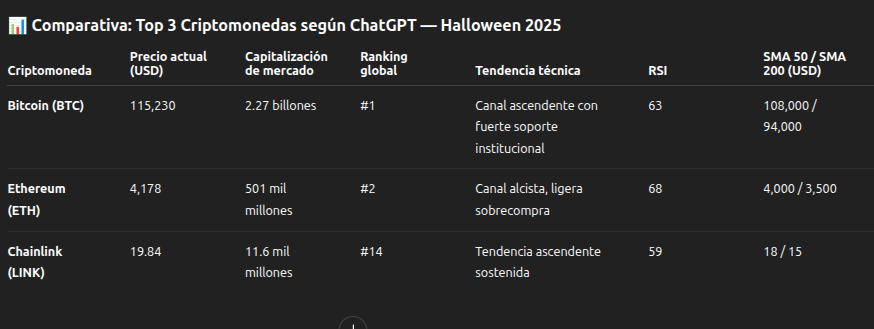 O ChatGPT, modelo avançado de inteligência artificial da OpenAI, apresenta sua previsão sobre o Bitcoin e identifica as criptomoedas com maior potencial de alta até o Halloween de 2025. Com base na análise de dados on-chain, momento técnico e adoção institucional, o sistema detecta três ativos que se destacam por sua estrutura de mercado, liquidez e fundamentos sólidos.