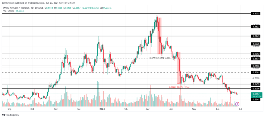 O preço da MATIC, negociado a US$ 0,55, está em uma baixa de nove meses, caindo mais perto do suporte crítico de US$ 0,53. As chances de uma recuperação a partir desse nível são altas, já que os fatores mencionados acima se inclinam a favor de uma recuperação.