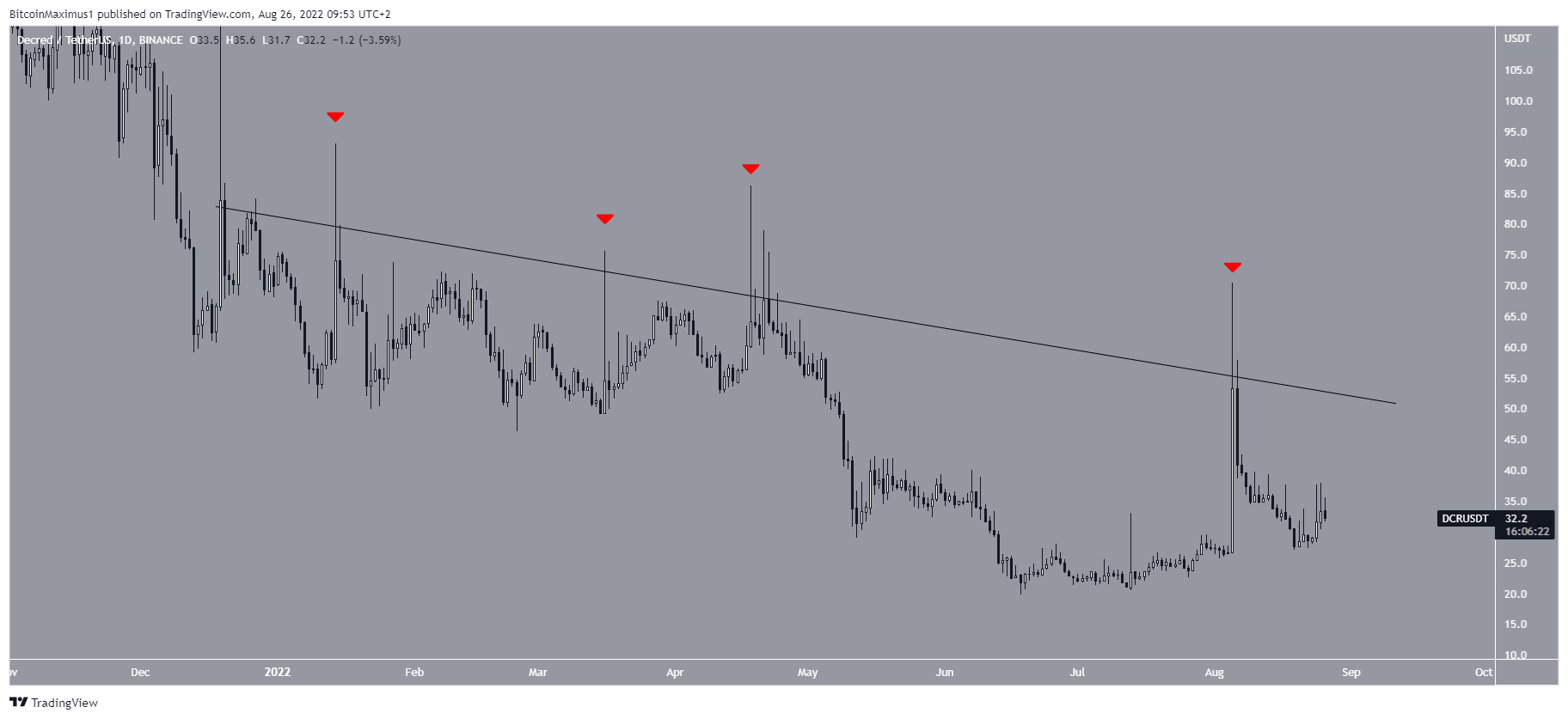 O DCR vem diminuindo abaixo de uma linha de resistência descendente desde dezembro de 2021. Até agora, a linha causou quatro rejeições (ícones vermelhos), a mais recente em 5 de agosto.