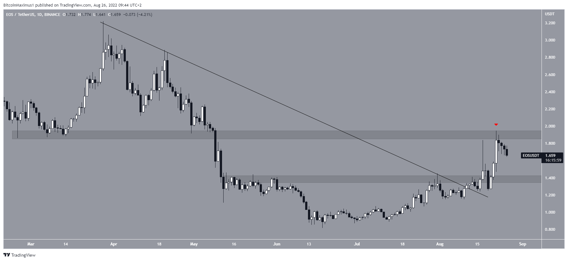 A EOS vem aumentando desde 18 de junho e saiu de uma linha de resistência descendente em 12 de agosto. A quebra levou a uma alta de US$ 1,95 em 22 de agosto.