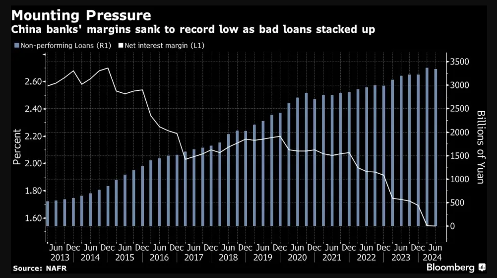 Embora essas intervenções tenham permitido que os seis maiores bancos aumentassem seus níveis de capital além dos requisitos, o Banco Industrial e Comercial da China Ltd. e o Banco da China Ltd., que haviam sido trazidos como financiadores para apoiar a economia, agora enfrentam margens recordes de baixa, lucros em queda e aumento da inadimplência.