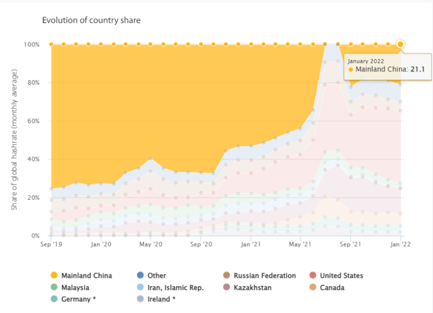 Mas os dados do Cambridge Center for Alternative Finance revelaram um aumento constante na atividade de mineração e, em janeiro de 2022, a China representava mais de um quinto do hashrate total do Bitcoin.
