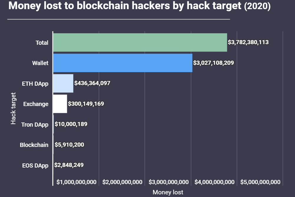 Sponsored SponsoredEm seguida estão as carteiras digitais utilizadas pelos investidores para armazenar criptomoedas. Apesar de estarem em terceiro lugar, com 27 ataques registrados em 2020, as invasões às carteiras deram o maior lucro aos cibercriminosos. Ao todo, foram US$ 3,03 bilhões roubados de carteiras de criptomoedas em 2020.