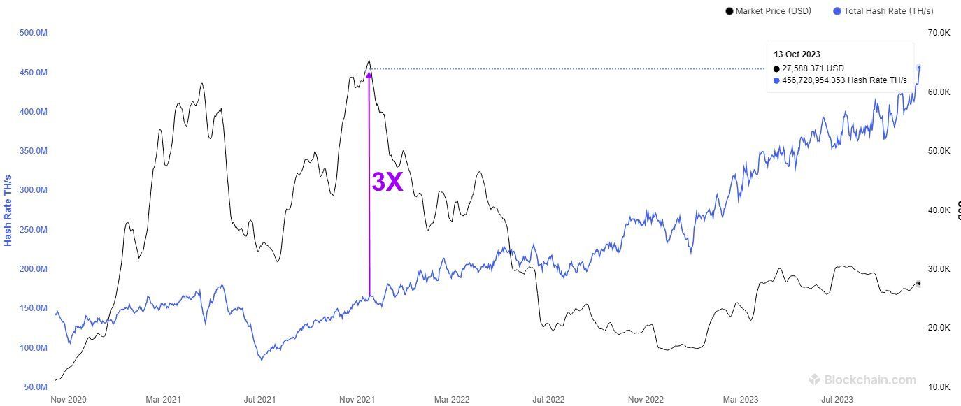 Hoje, a rede Bitcoin tem cerca de 3x a taxa de hash que tinha quando a máxima histórica de preço foi alcançada.