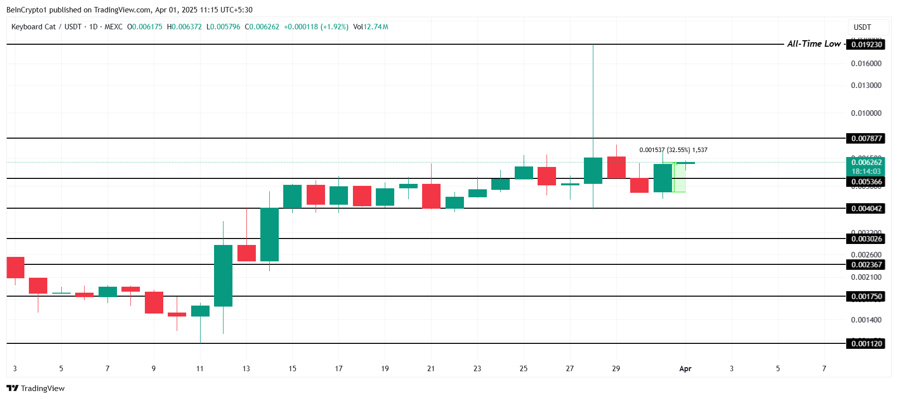 Enquanto Keyboard Cat (KEYCAT) não teve um aumento tão explosivo quanto DOGINME, ainda registrou um ganho sólido de 32%. A altcoin está atualmente sendo negociada a US$ 0,0062 e busca romper o nível de resistência em US$ 0,0078, que se manteve forte nos últimos dois meses.