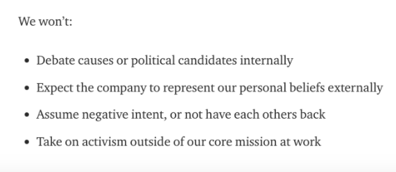 Mas o núcleo do plano de Armstrong pode ser resumido em dois pontos, “questões sociais mais amplas: não nos envolvemos aqui quando as questões não estão relacionadas à nossa missão principal” e “causas políticas: não defendemos nenhuma causa específica ou candidatos internos que não estejam relacionados para a nossa missão. ”