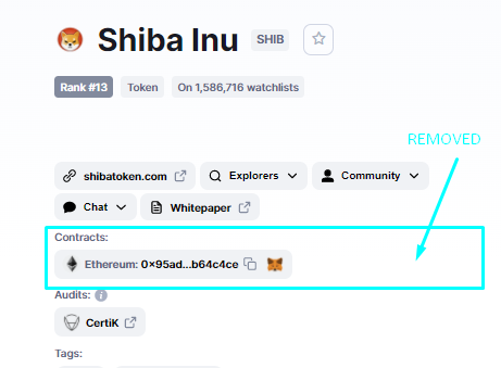 Conforme observado por @shibainuart, o perfil da Shiba Inu possui somente o seu endereço de contrato ERC-20 como oficial e listado no site. Anteriormente, a divulgação de outros endereços havia sido motivo de discussões entre a equipe responsável pela criptomoeda e o popular site de monitoramento do mercado cripto.