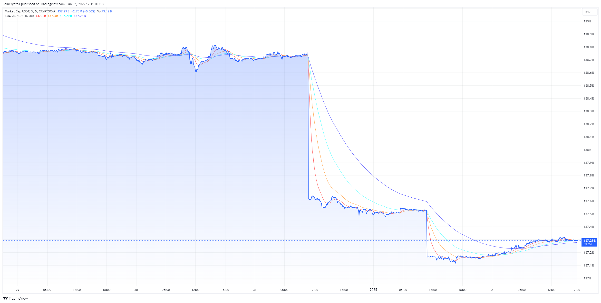 Markets in Crypto Assets (MiCA) entrou em vigor na União Europeia, e a comunidade está particularmente ansiosa para ver como isso impactará a Tether. Quando o prazo ocorreu em 30 de dezembro, o valor de mercado do USDT caiu em US$ 2 bilhões.