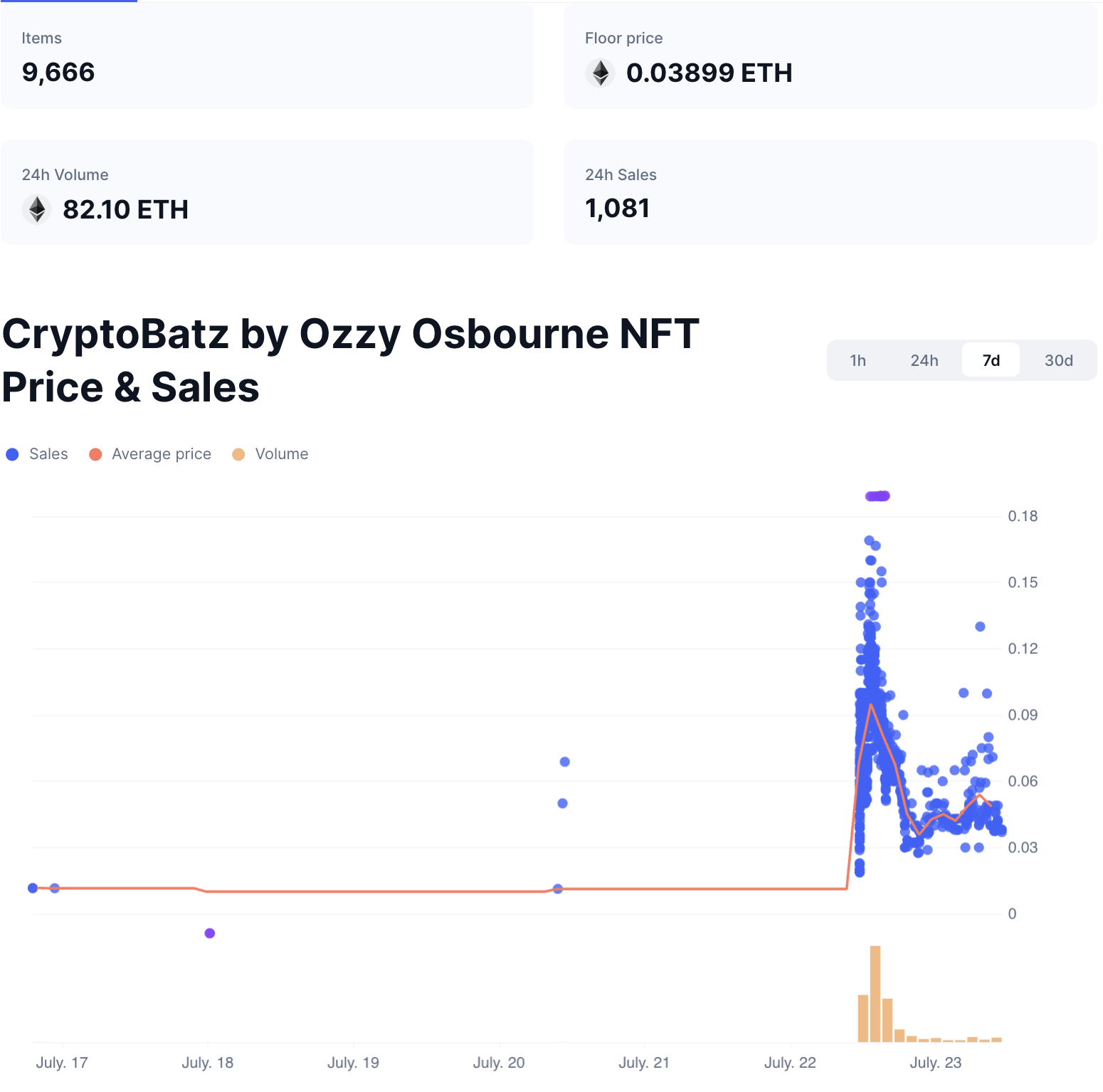 O vocalista do Black Sabbath, Ozzy Osbourne, está novamente viral no ecossistema cripto, pois sua coleção de tokens não fungíveis (NFT) “CryptoBatz” na OpenSea apreciou mais de 400% após seu falecimento. Os 9.966 “morcegos digitais” foram lançados na OpenSea no final de 2021, durante o boom dos NFTs.