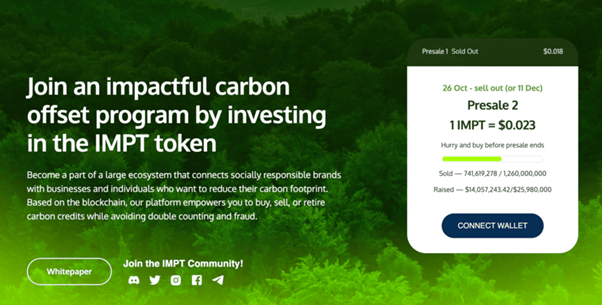 O projeto de criptomoeda ecológica, IMPT, anunciou os seus planos para terminar a pré-venda em 12 de dezembro, após o levantamento de mais de 13 milhões de dólares. O fim da venda antecipada será seguido de uma primeira oferta de exchange (IEO) na Uniswap, no dia 14 de dezembro.