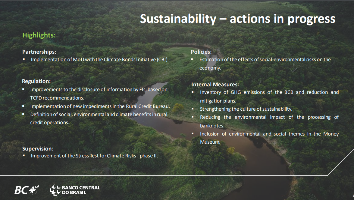 Além disso, o economista listou ações de sustentabilidade da agenda BC, como a redução do impacto ambiental no processamento de notas e inclusão de benefícios sociais, ambientais e climáticos nas áreas rurais.
