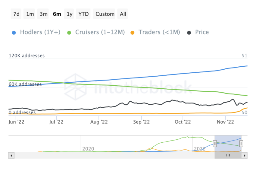 O recente aumento de preços foi apoiado por um salto maciço no número de endereços de traders. Dados do IntoTheBlock apresentaram que, enquanto os endereços de detentores aumentaram 12,61%, os endereços dos traders testemunharam um crescimento impressionante de 215,07% nos últimos 30 dias.