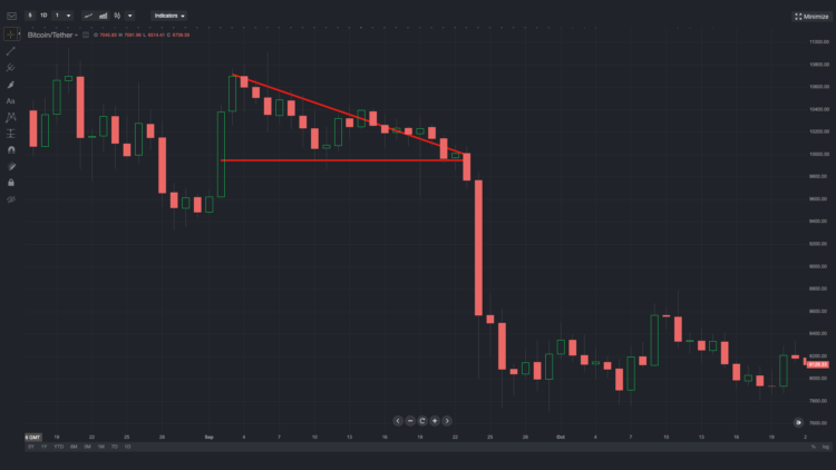 Se você traçar um triângulo descendente, um movimento significativo abaixo da linha de tendência inferior pode ser o início de uma tendência de baixa – e é quando você deseja abrir sua posição vendida.