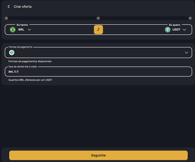 - Crie um Anúncio para comprar USDT: Clique no botão “+” no fundo, selecione BRL em “Eu tenho” e USDT em “Eu quero”, adicione sua Chave PIX em “Formas de pagamento” e escolha quantos reais quer oferecer por cada USDT que deseja comprar.