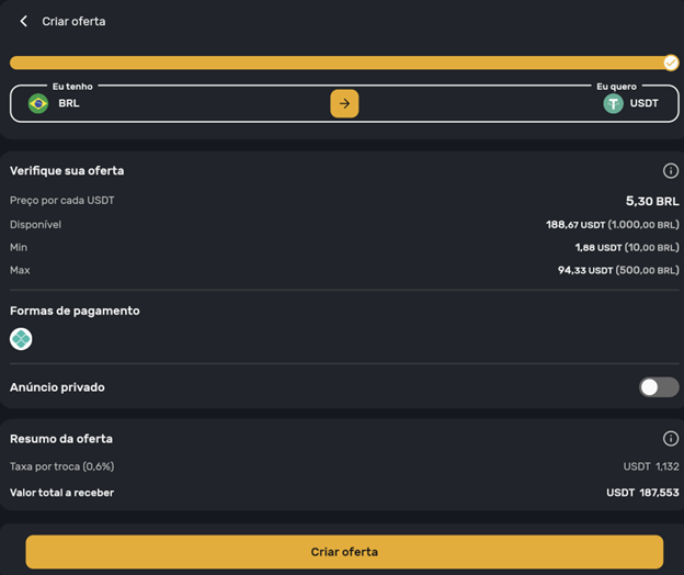 - Venda de USDT para Real: Uma vez comprados esses USDT, publique outro anúncio inverso para vender esses USDT para real a uma cotação mais alta.