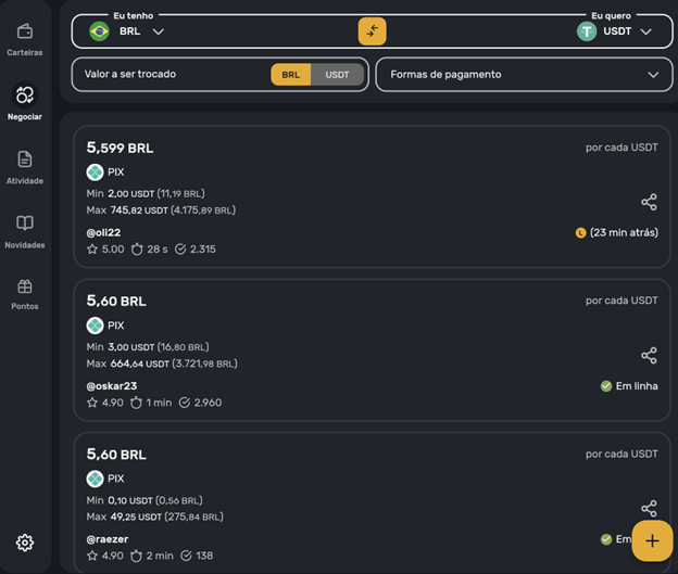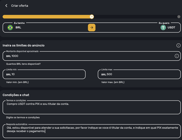- Compra de USDT via PIX: Publique um anúncio para comprar USDT a uma taxa competitiva.