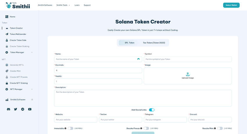 Criar um token Solana (SPL Token) é um processo sem complicações com a Smithii Tools. A jornada começa com o Criador de Token Solana, uma ferramenta fácil de usar projetada para simplicidade e eficiência.