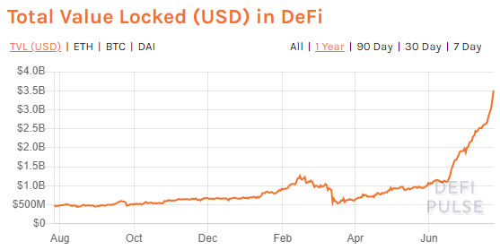 O crescimento nos mercados de DeFi parece estar parabólico. Ontem, o valor total bloqueado atingiu uma nova alta histórica de US $ 3,5 bilhões, de acordo com a DeFi Pulse. O bloqueio da Ethereum também atingiu um novo pico, com 4 milhões de ETH, ou 3,6% de todo o suprimento, vinculados a contratos inteligentes para mercados de empréstimos.