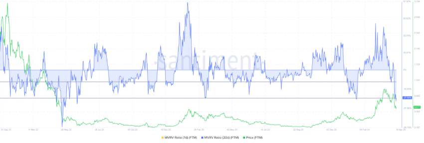 O MVRV de 30 dias de -27% sugere perdas, possivelmente levando a uma interrupção da venda. Historicamente, o indicador entre -12% e -27% geralmente precede as altas da FTM, o que o torna uma zona de oportunidade de acumulação.