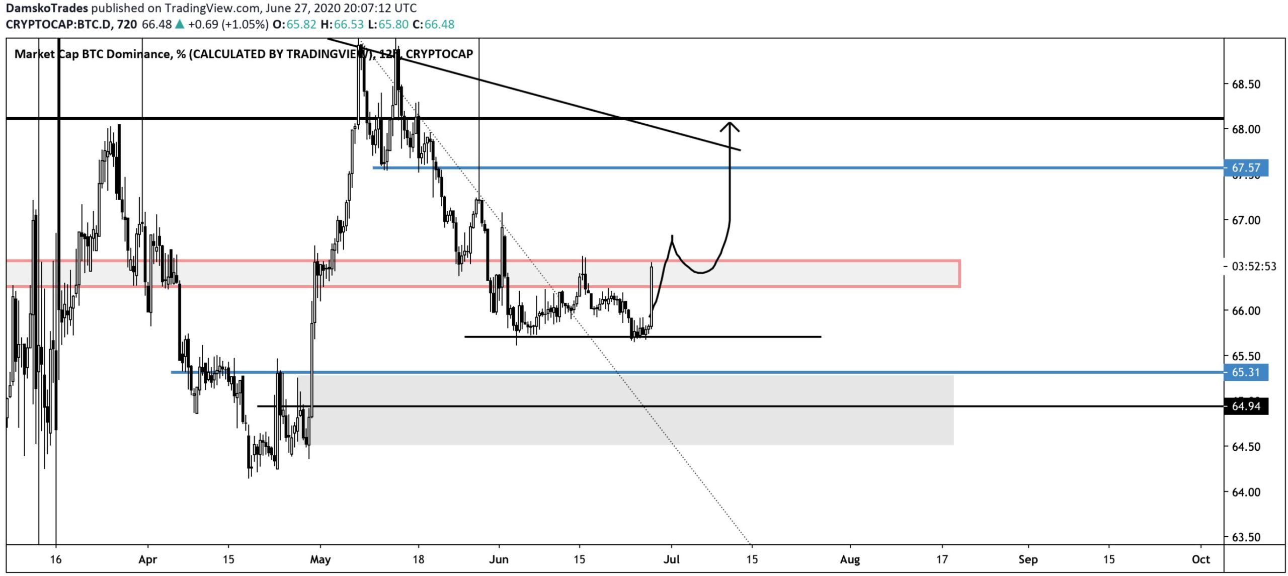 O gráfico diário fornece uma imagem de baixa para o BTCD. Ele partiu de uma linha de suporte ascendente de longo prazo em 18 de junho e a alta subsequente em 27 de junho se assemelha a um re-teste dessa linha de suporte.