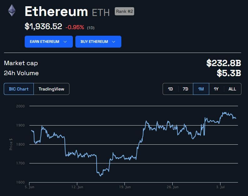 O Ethereum não conseguiu atingir o nível crucial de US$ 2.000 durante o último rali cripto. Em seguida, o preço voltou a recuar, caindo 1% no dia para US$ 1.936 no fechamento desta matéria.