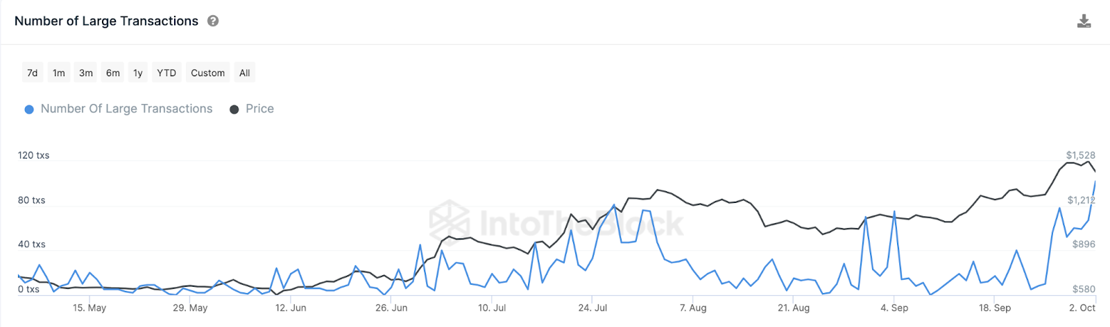 Como tal, o gráfico IntoTheBlock abaixo mostra como as Whale Transactions aumentaram de 30 transações para 218 transações entre 17 de setembro e 2 de outubro.