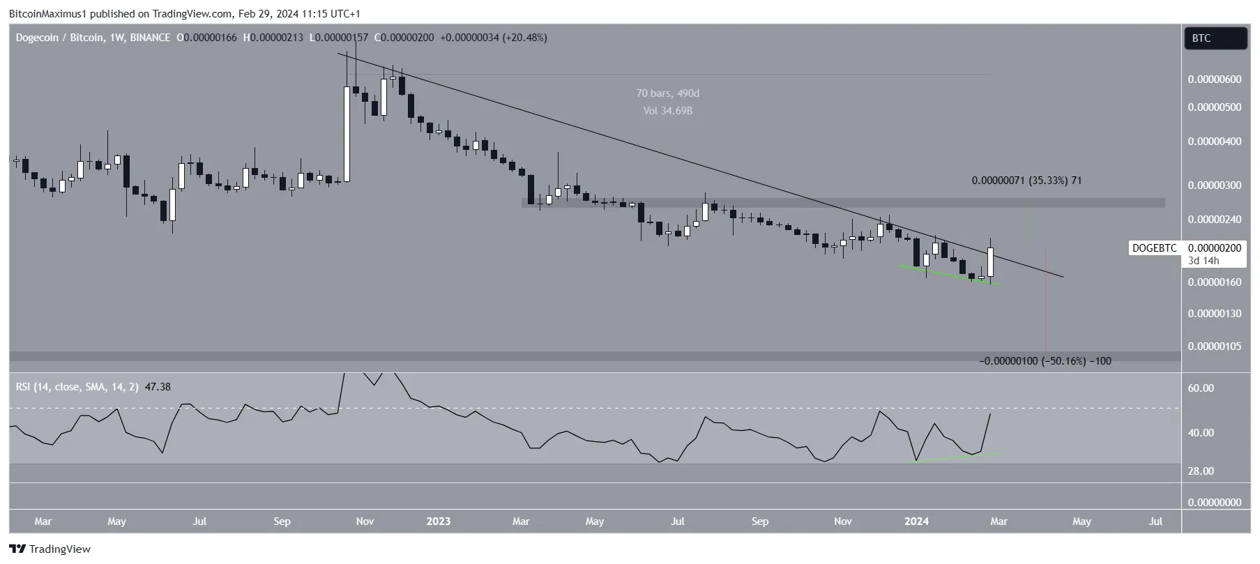A Dogecoin caiu abaixo de uma linha de tendência de baixa desde outubro de 2022. A queda levou a uma mínima de 157 satoshis esta semana. No entanto, o preço saltou e criou um grande candle semanal de alta.