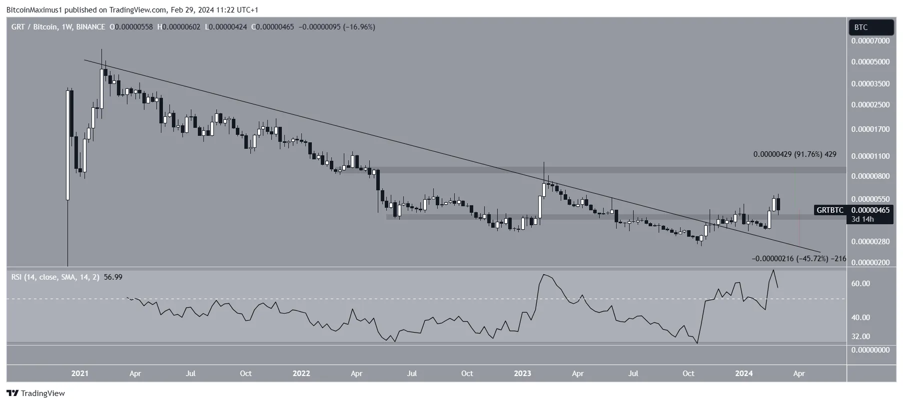 O rompimento foi combinado com um salto do RSI acima de 50, dando ainda mais legitimidade. Portanto, se a tendência de alta continuar, o GRT pode subir mais 90% e atingir a próxima resistência em 900 satoshis.