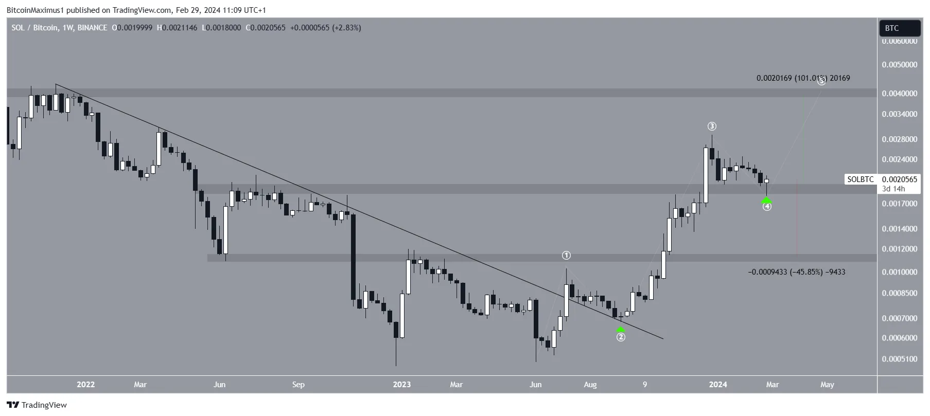 O gráfico semanal mostra que a Solana está tem tendência de alta desde que rompeu uma linha de tendência de baixa de longo prazo e a validou como suporte (ícone verde) em setembro de 2023. O aumento levou a uma alta de 0,0029 satoshis em dezembro de 2023.