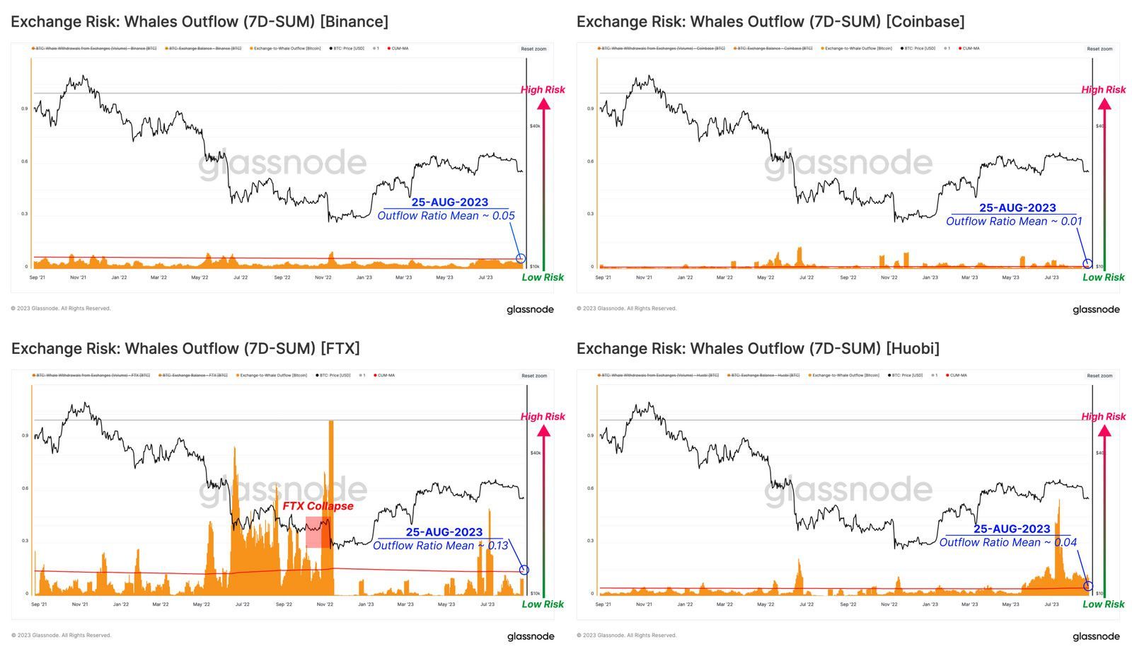 Tanto a Binance quanto a Coinbase mostraram uma taxa de saque de baleias muito baixa nos últimos dois anos. No entanto, as baleias observaram um aumento sustentado na atividade de retirada em relação a Huobi nos últimos meses.