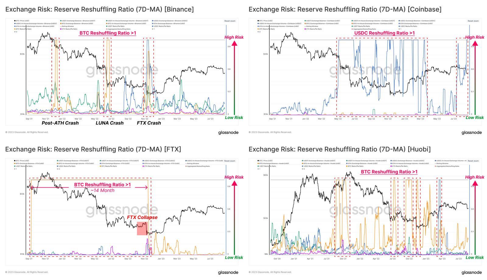 “A taxa de remodelação do BTC sinalizou um status de alto risco durante 14 meses antes do colapso da exchange”, observou a Glassnode sobre a FTX.