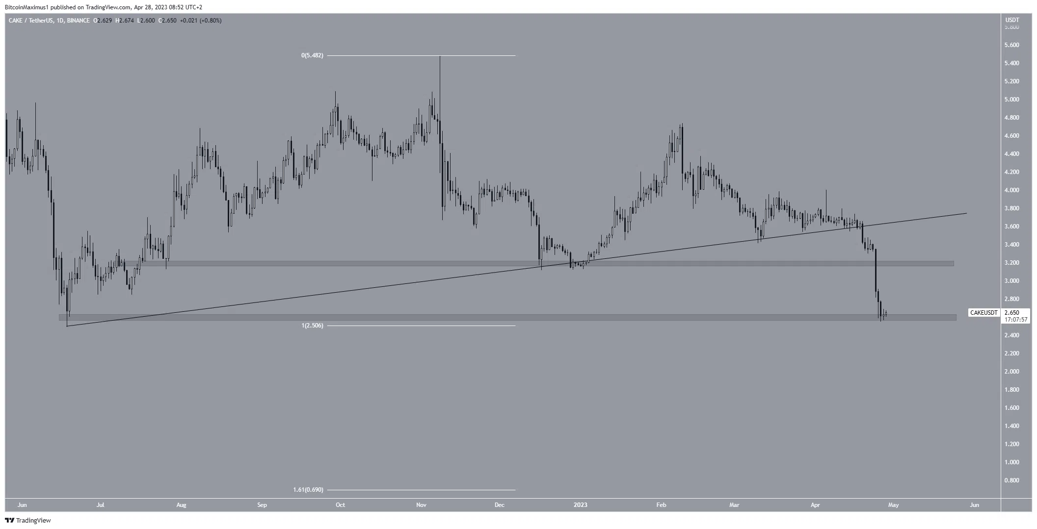 A CAKE caiu desde que perdeu uma importante linha de suporte ascendente em 19 de abril. Anteriormente, a linha estava em vigor desde junho de 2022. Portanto, a perda significa que o movimento ascendente terminou.