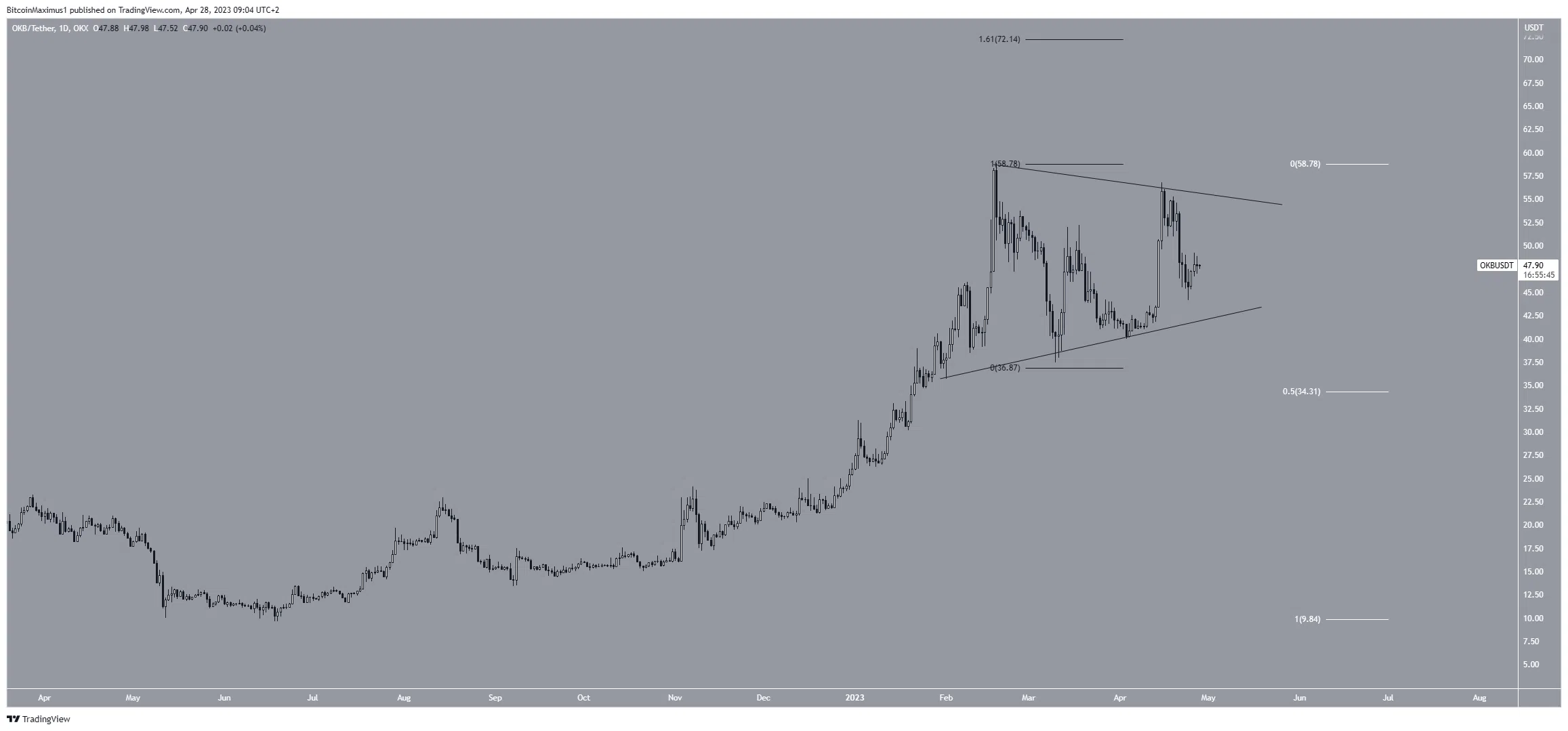O OKB é negociado dentro de um triângulo simétrico desde 17 de fevereiro. O triângulo simétrico é considerado um padrão neutro, o que significa que tanto um colapso quanto um rompimento são possíveis. Atualmente, o token é negociado no meio do padrão.