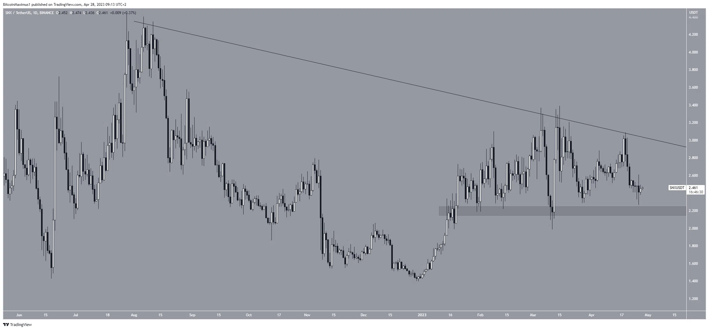 A SNX caiu sob uma linha de resistência descendente desde agosto de 2022. Mais recentemente, a linha causou uma rejeição em 19 de abril. Agora, o token está sendo negociado perto da área de suporte horizontal de US$ 2,20.