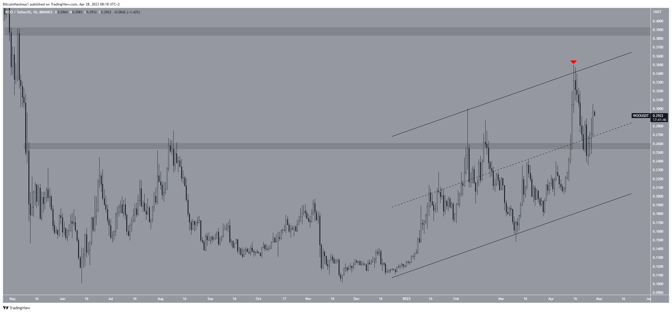 No entanto, o WOO saltou na área de suporte horizontal de US$ 0,26 em 24 de abril (ícone verde) e iniciou um movimento ascendente.