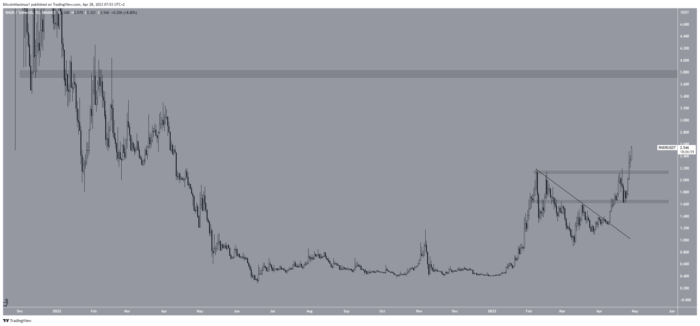 O preço do RNDR saiu da área de resistência horizontal de US$ 2,15 em 26 de abril, e atingiu uma nova alta anual de US$ 2,55 dois dias depois. Devido à falta de resistência aérea, a ação do preço sugere que o movimento ascendente pode acelerar ainda mais.